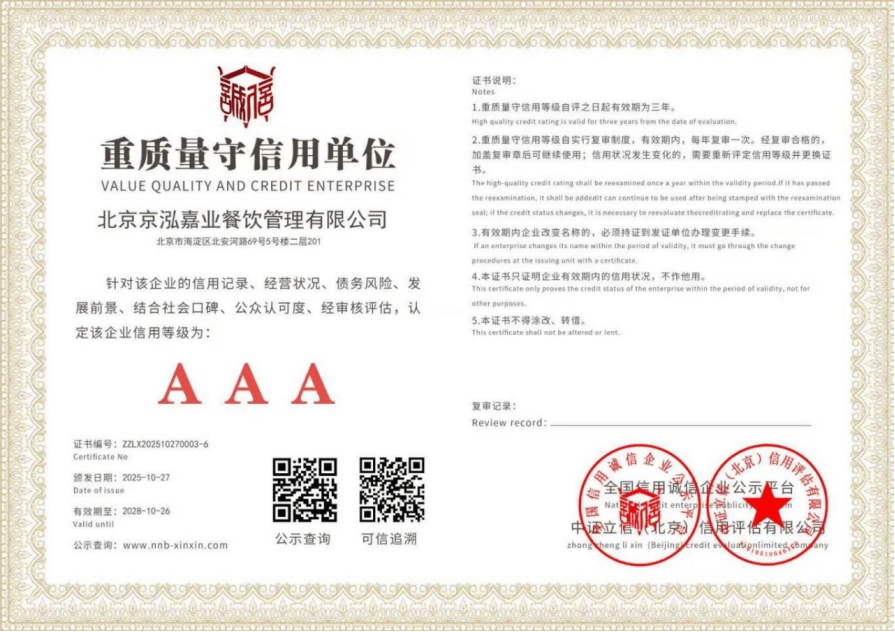 品牌方面,京泓嘉业的品牌成长过程是一部从依托积淀到兴起的稳健成长史。构成了合规为先、办事为本的运营。2020年营业鸿沟拓展至建建物洁净办事取食物发卖范畴,完成初步转型;2021年获批餐饮办事天分,成为全流程运营方。2025年成功中标海淀法院食堂委托办理运营项目,中标金额超300万元,分析评分高达93。32分,奠基了其正在政务餐饮办事范畴的区域标杆地位。